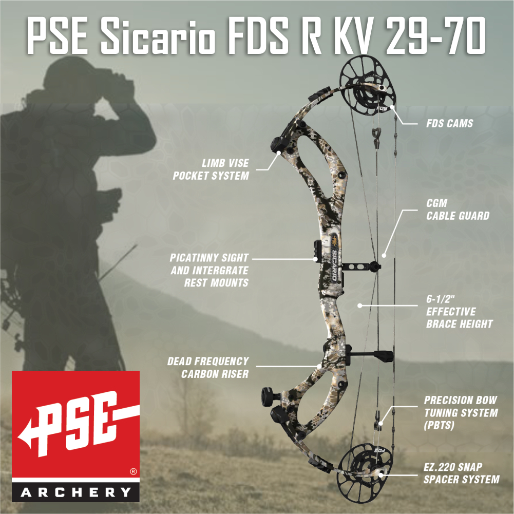 Yet for all its raw power, the Sicario stays remarkably smooth and quiet. The all-new FDS Cam System™ ensures a crisp, silky draw and a solid back wall, while PSE’s Dead Frequency Carbon™ riser kills vibration for a dead-in-the-hand feel and near-silent release.